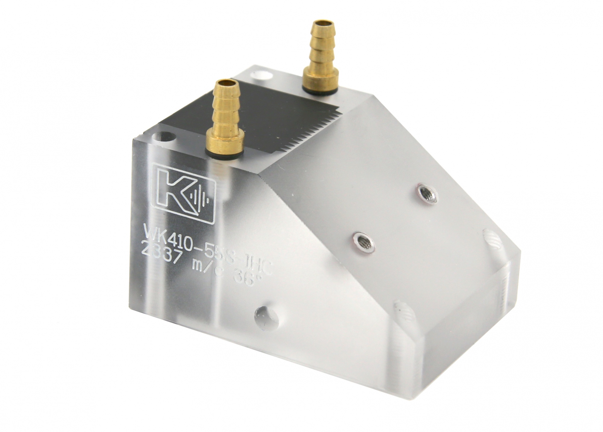 Призма наклонная для механизированного и автоматизированного УЗК, с твердосплавными вставками и штуцерами подачи акустической жидкости. Для поперечных волн, угол ввода центрального луча 55 град.